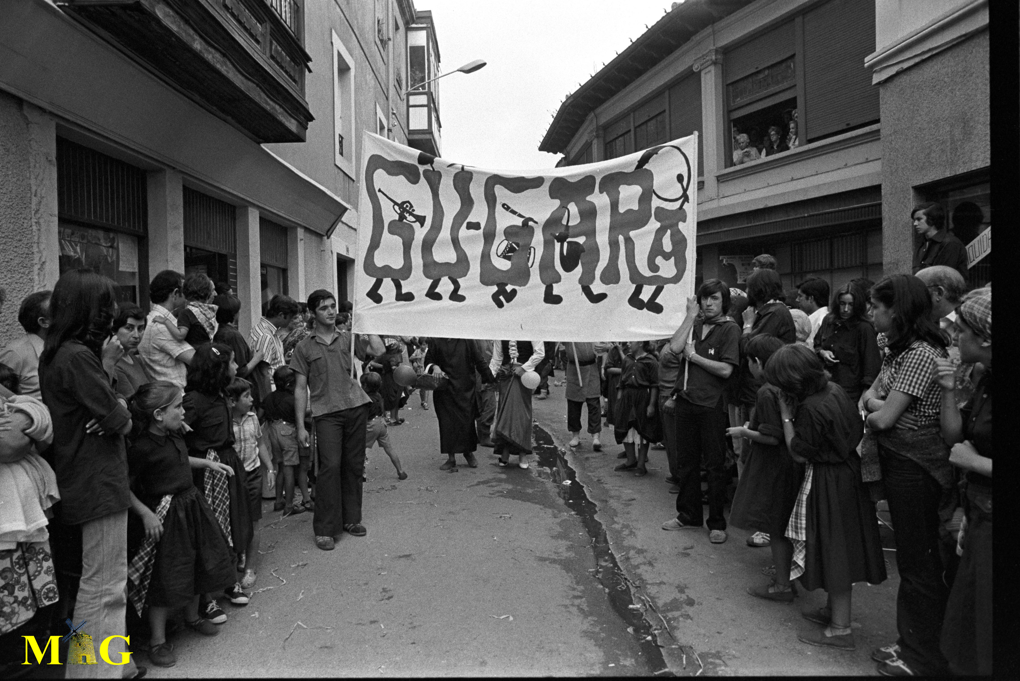 El anagrama del grupo «Gu Gara» lo diseño Eloi Gallastegi: “...Aunque el primer año salimos con letras, que las chicas nos habían cosido a la camisa, estaban hechas con unos trozos de plástico o tela. Las letras nos las hizo Juan Jeijo. Nuestro atuendo era de color azul arrantzale. Al año siguiente, Eloi Gallastegi, nos confeccionó el anagrama, que es el que mantenemos en la actualidad; fue una “revolución” para la época, era una novedad, ya que la gente solía pintarse el nombre de la cuadrilla con tiza o lo hacían con tela. El primer año, entre chicos y chicas, rondaríamos los 50-60 componentes...”